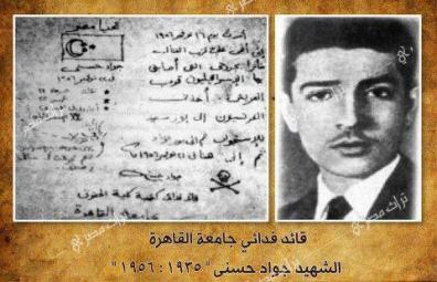 جواد حسني (قائد كتيبه فدائي كليه الحقوق جامعة القاهره ) ------------------------------------------------------------------------ اخر كلماته ليس المهم أن أعيش..المهم أن تنتصر مصر ويهزم الأعداء" بعد معلومات استخبارتيه بوجود قوة لقوات الكومندوز الفرنسيه علي ارض سيناء اثناء العدوان الثلاثي تقدم جواد حسني للدفاع عن ارض مصر هو ومجموعة من زملائه ولكن اثناء التقدم قابلتهم كتيبه صهوينه مرابطه عند الكيلو 39 واصيب جواد اثناء الاشتباك ورفض العوده مع زملائه ، وواصل التقدم حتى وصل إلى الضفة الشرقية التي احتلتها القوات الفرنسية، فاشتبك مع دورية فرنسية وكان مدفعه سريع الطلقات (600 طلقة في الدقيقة) فظن الفرنسيون انهم يحاربون قوة كبيرة فطلبوا النجدة، فإذا بقوة من الجنود الفرنسيين تتقدم تجاهه واخذ جواد يقذفهم بالقنابل اليدوية مع نيران مدفعه ودماءه تنزف، فسقط مغشيًا عليه، فتقدمت القوات نحوه وهى تظن أن هذا السقوط خدعة، فوجدت شابًا في الحادية والعشرون من عمره ملقى وسط بركة من الدماء يحتضن مدفعه ويقبض على قنبلة شديدة الانفجار، فنقلوه إلى معسكر الأسرى وسجل بدمائه التي تنزف قصة اعتقاله وتعذيبه يوم بيوم ابتداء من يوم اسره في 16 نوفمبر 1956. رفض جواد أن يبوح بأى كلمة من أسرار الوطن، فأوهمه قائد القوات الفرنسية أنه سيطلق سراحه وأمره بالخروج من حجرة الأسرى، وأثناء سيره أطلق الجنود الفرنسيون رشاشاتهم على ظهره فسقط شهيدا في الثاني من ديسمبر 1956. |