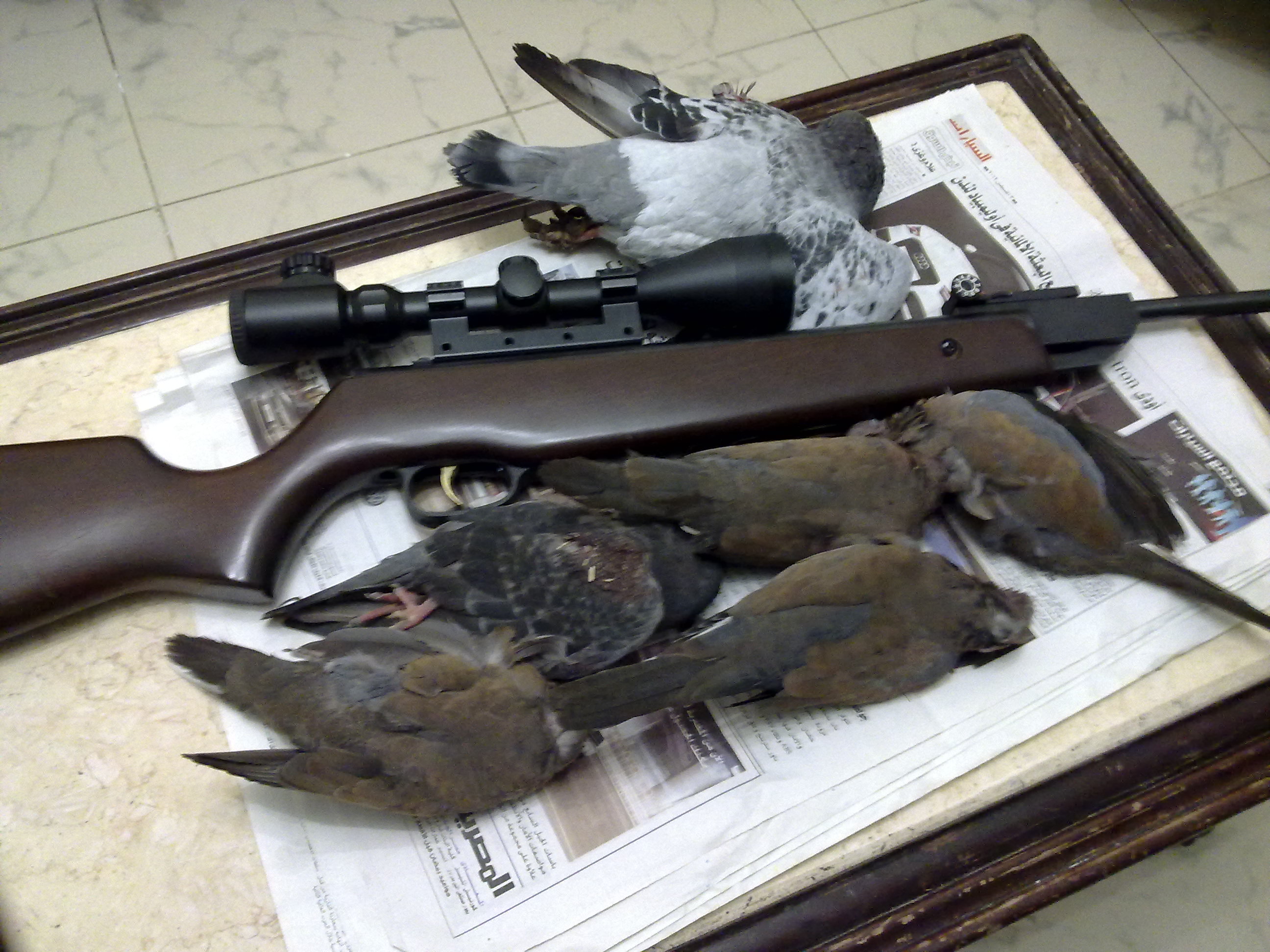 النهارده يوم جميل من البداية فقولت اطلع ساعة كدة تمشية و اجرب النوريكا جت بعد التعديل اللى عملته و كمان اجرب الرش الجديد و الحمد لله ضربت 11 رشة ب 11 طيره .... 2 فرد حمام و 5 يمام واحده منهم ضاعت و 4 غراب ... بصراحة البندقية بقت موس و اللى يقول نمرة واحد عيار تافه يبقى لسه مجربش العيار ده محترم جدا جدا و دقيق جدا و بيقفل الطير مكانه