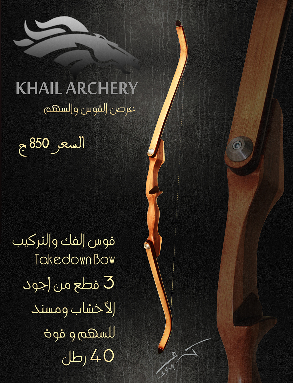 القوس مكون من 3 قطع بنظام الفك والتركيب بالألانكيه ومصنوع من خشب الجوز التركى ومعه وتر ويمتاز بالقوة والمرونه العالية ودقة فى التصويب وبيضرب أسهم الكاربون والالومنيوم والخشب وقوته 40 رطل معقولة جدا ومناسبة للتدريب والصيد ، مع الشكر