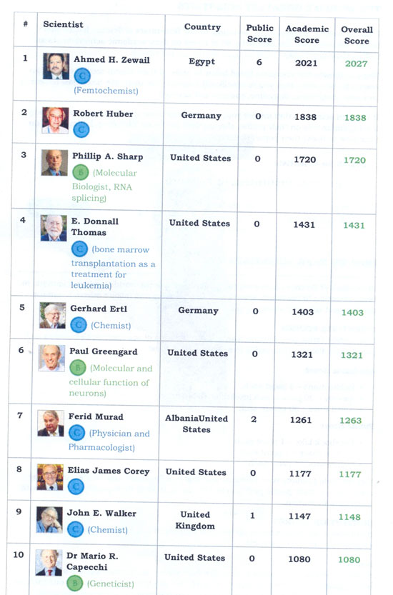 جدير بالذكر أن المشرفين على هذا التقييم العالمى صنفوا الدكتور أحمد زويل باعتباره عالما مصريا، وأضافوا اسم مصر إلى جوار اسمه فى القائمة التى تضم أحمد زويل فى المركز الأول، وبقية العلماء فى المراكز التالية له.