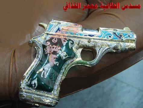 وطبنجة القذافي الألماس دي لبنته،وأعتقد كذلك طبنجة الرئيس أنور السادات لحرمه،ومن قتل القذافي ليس بالصوره بل هي غنايم العزيزيه